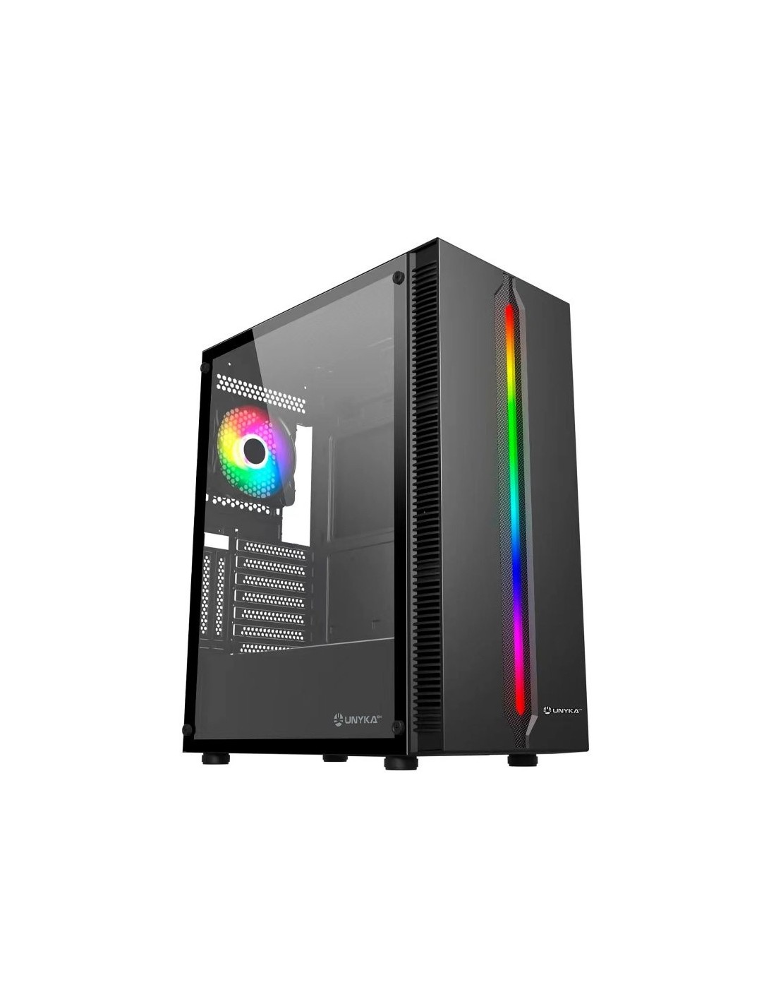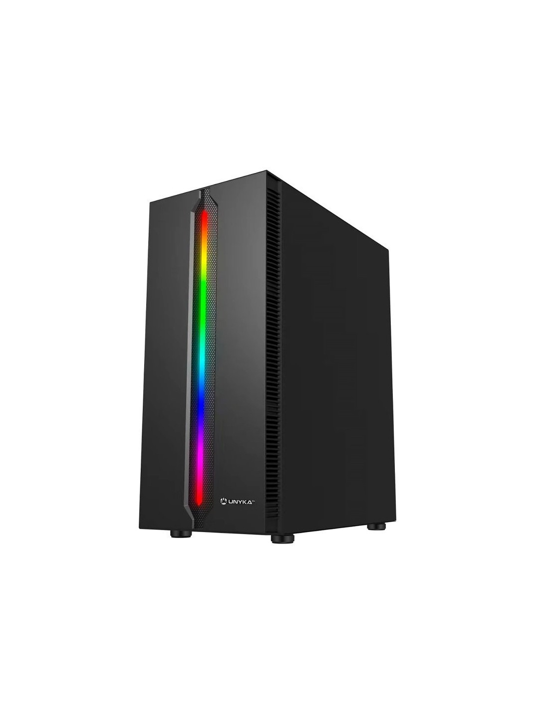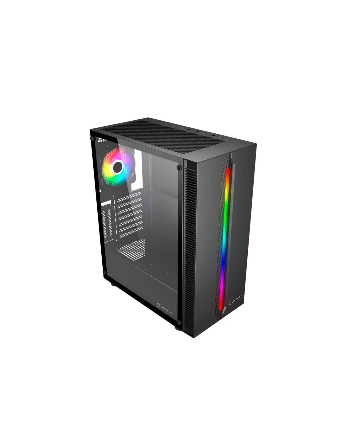 Caja de formato ATX con un poderoso frontal partido por una tira led ARGB que lo recorre en vertical y que le confiere un carácter único. Ese frontal led luminoso está flanqueado por rejillas verticales que permiten una óptima refrigeración. La torre Lumina 205 de UNYKAch está diseñada pensando en los entusiastas del gaming y es la opción perfecta para construir tu próximo equipo.