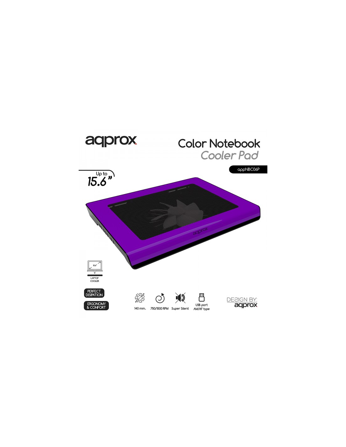 Dispone de un atractivo diseño exclusivo de Approx con 2 leds, y un funcionamiento realmente silencioso y efectivo. El APPNBC06 suministra máxima potencia y disipación en un diseño extraplano. Se alimenta a través de entrada USB. Fabricado en un diseño elegante y de gran calidad. Diponible en cinco colores con base y rejilla regra: negro, blanco, azul, rojo y púrpura.